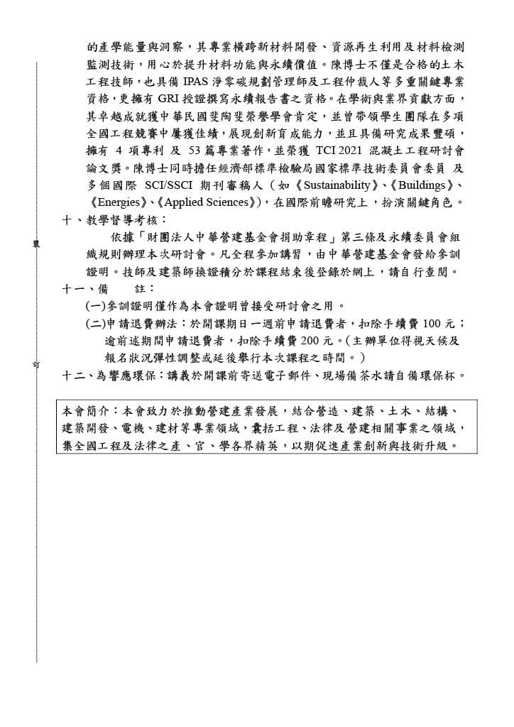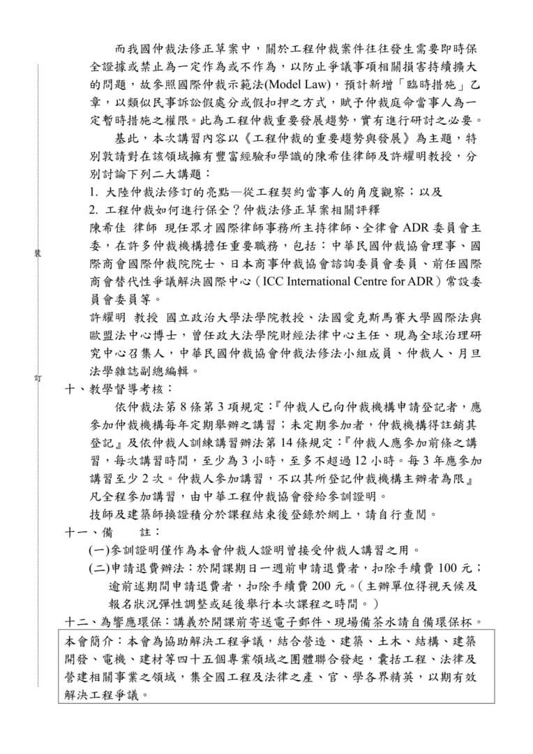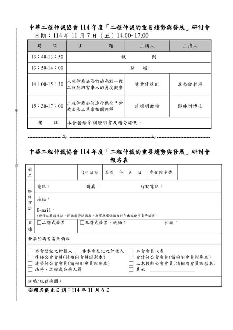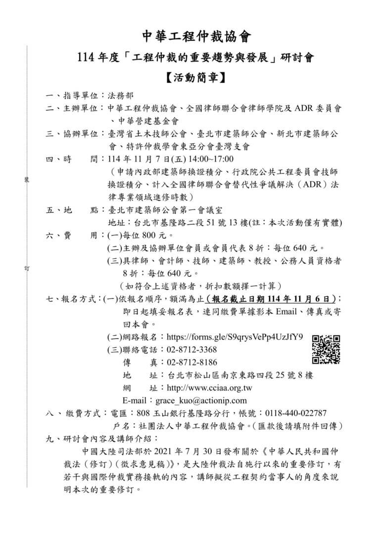 中 華 工 程 仲 裁 協 會 【活動簡章】-114年度「工程仲裁的重要趨勢與發展研討會」邀您一起加入 2025-10-15 114年度「 工程仲裁的重要趨勢與發展 」研討會 【活動簡章】 → 報名活動簡章 : 下載